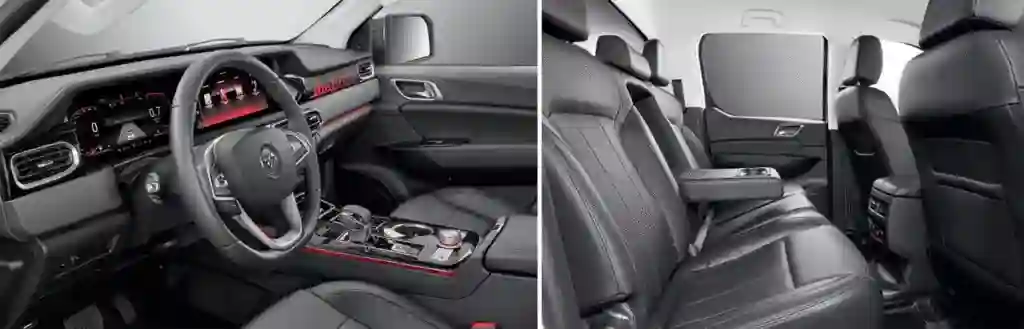 Нет, мы не про плавность хода – никогда полноприводный грузовик, даже маленький, не сравнится здесь с солидным седаном. Зато по отделке салона и оснащению никто не мешает ему выступать в высоком классе. По сравнению с TUNLAND G7 тут изменилось все! Абсолютно новые, удобные кресла с подогревом, вентиляцией и электрорегулировками, отделка искусственной кожей разной текстуры, «металлические» декоративные элементы, подсветка, два больших «телевизора» – цифровая комбинация приборов и дисплей мультимедийной системы, подушки передние, боковые и шторки в придачу. Перечень полезных или просто модных элементов оснащения машины занимает пару страниц мелким шрифтом: подогревы, ездовые ассистенты, беспроводная зарядка, розетка на 220 V, система кругового обзора, бесключевой доступ и запуск, и многое, многое другое.